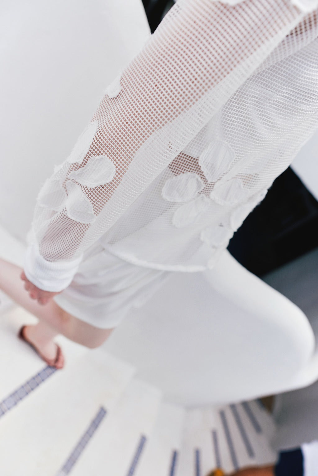 Blusa de malla con encaje de flores blanca. Elegante y muy vestidora, que resaltará a donde vayas. Úsala con pantalones para algo más formal o con un short para un look más casual.
