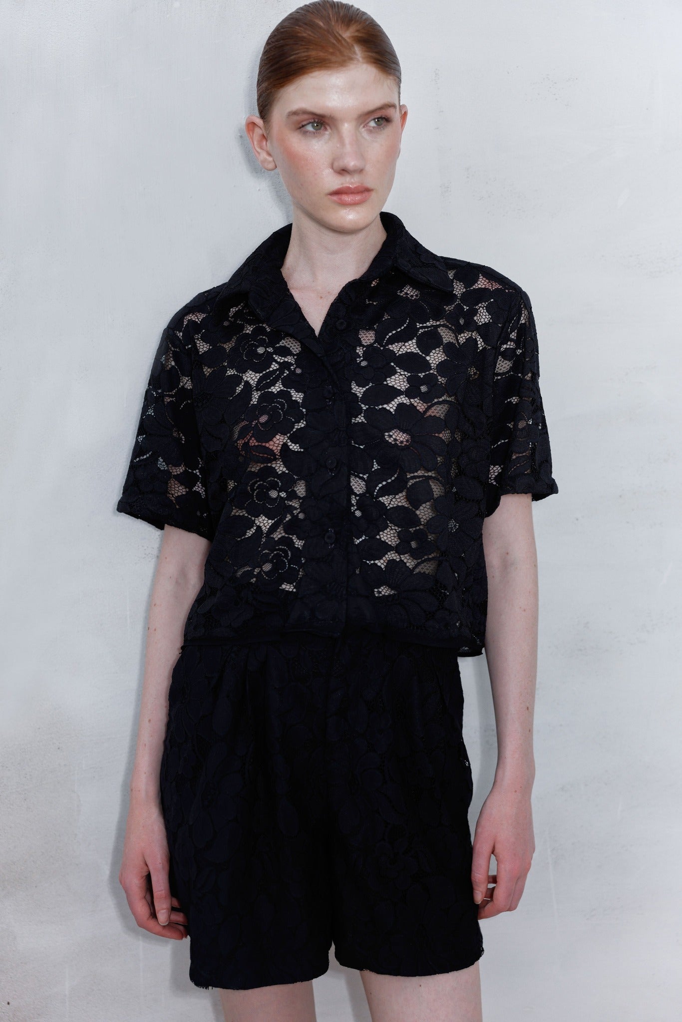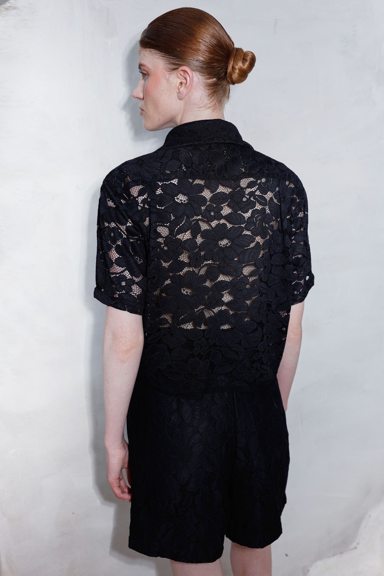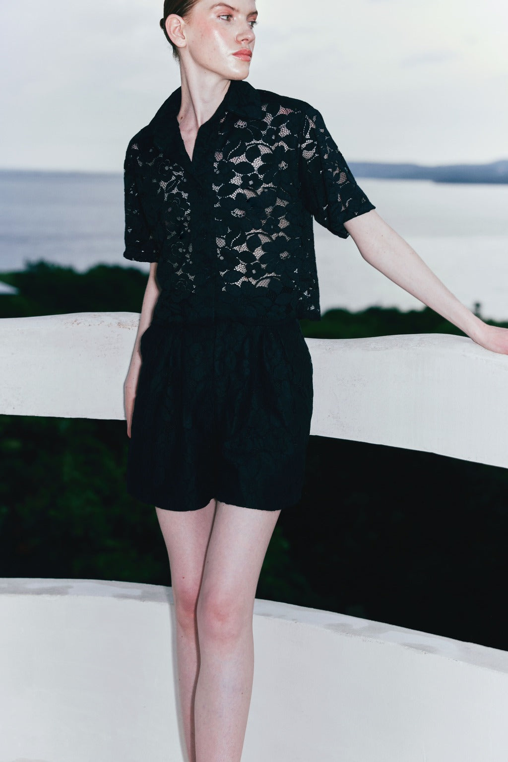 Set de encaje negro. El short con pliegues adelante y una silueta suelta y la blusa oversize. Usa la blusa sola con un jean o pantalon para cambiar el look y darle nuevos usos.