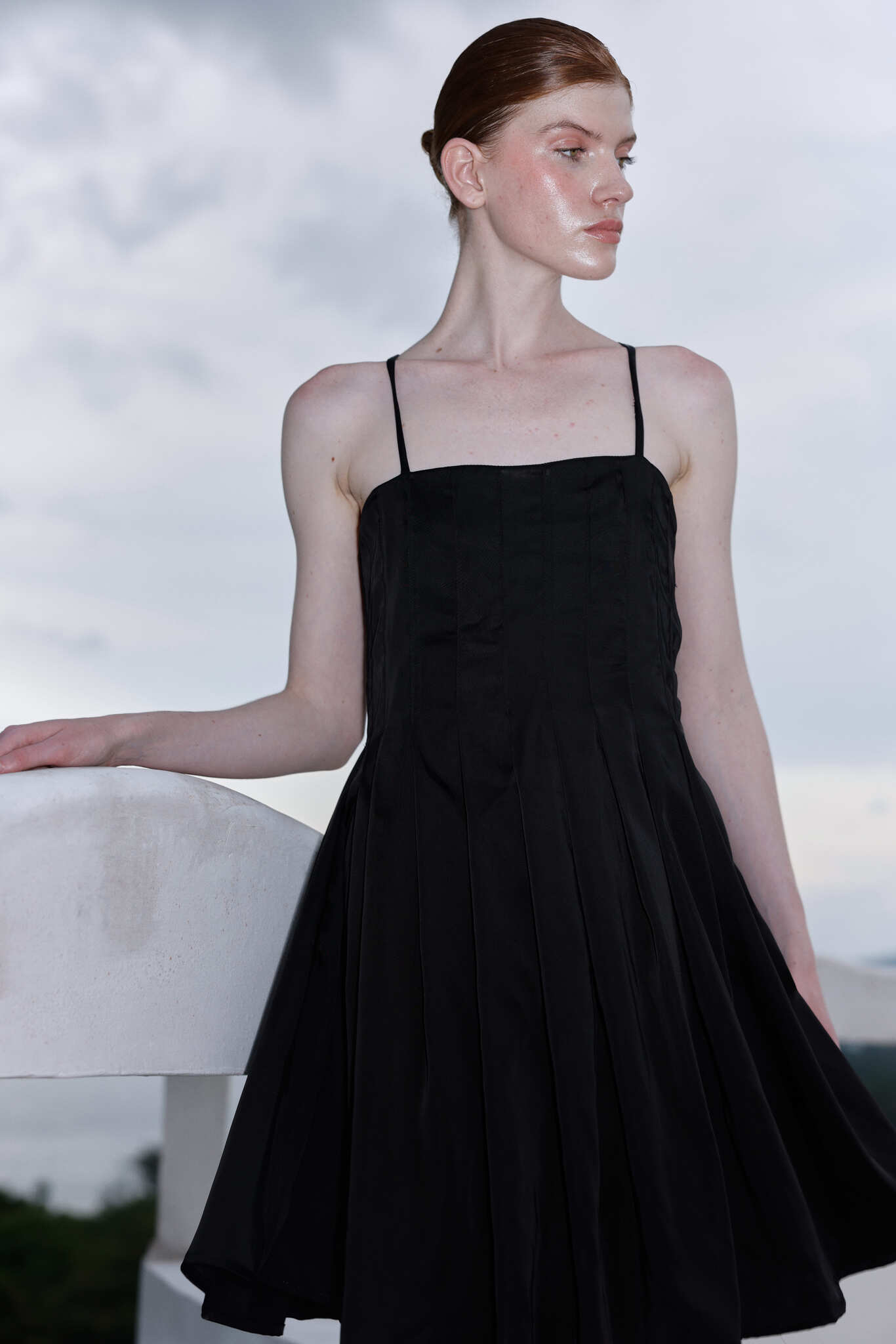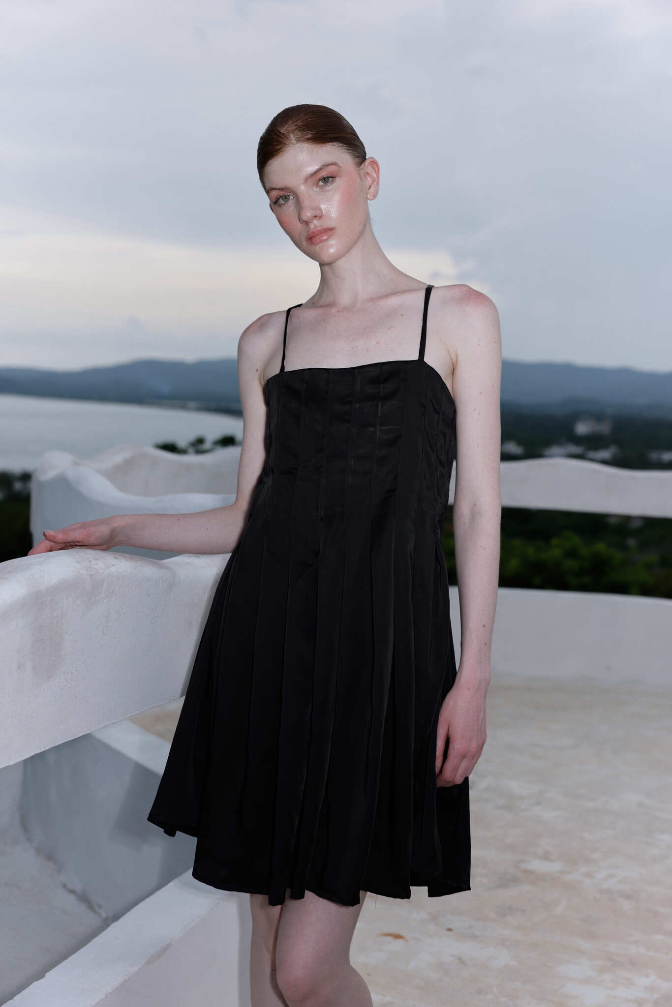 VESTIDO CORTO VINTINTO O NEGRO DE TIRAS CON ALFORZAS EN SEDA. RESALTA LA PARTE SUPERIOR Y ABAJO ES SUELTO PARA MAYOR COMODIDA. USALO PARA UN EVENTO TIPO COCTEL.