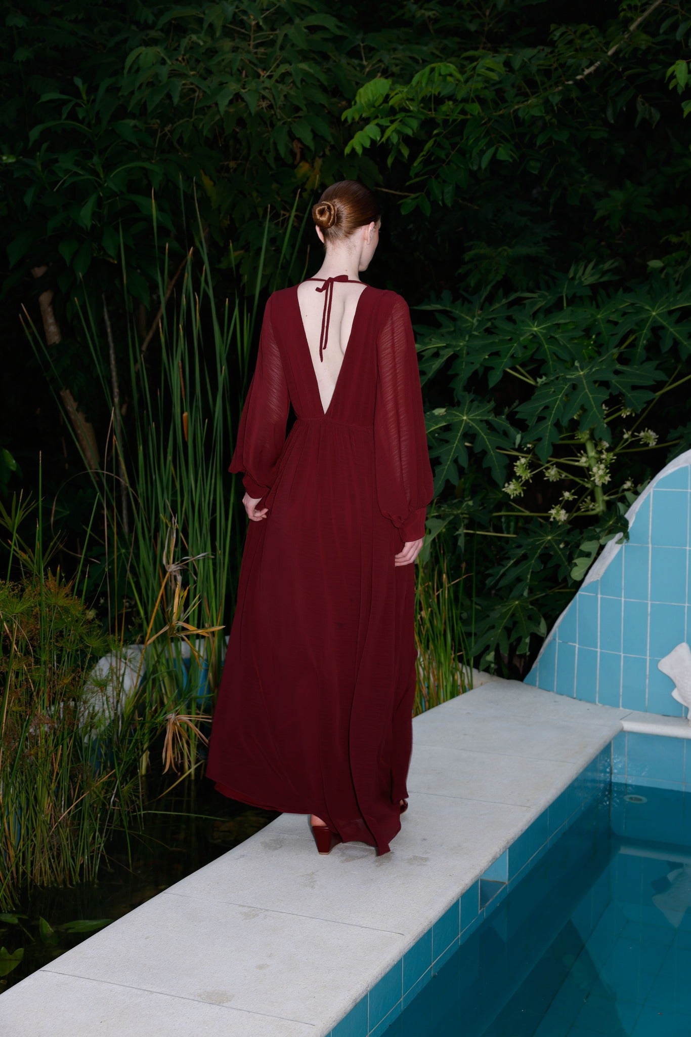 VESTIDO LARGO CON MANGAS. TIENE UN ESCOTE QUE PUEDES USAR ABIERTO O MAS CERRADO DE ACUERDO A TU GUSTO Y SU FALDA AMPLIA Y COMODA QUE LE DA VUELO. ES UN VESTIDO ROMANTICO, ELEGANTE Y MUY FEMENINO.